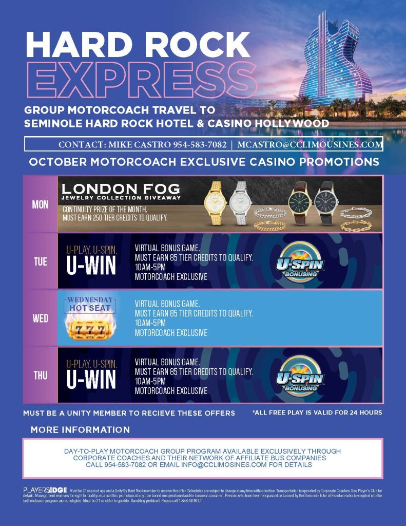 Enjoy round trip travel to Seminole Hard Rock Hotel & Casino Hollywood and receive Slot Free Play.
